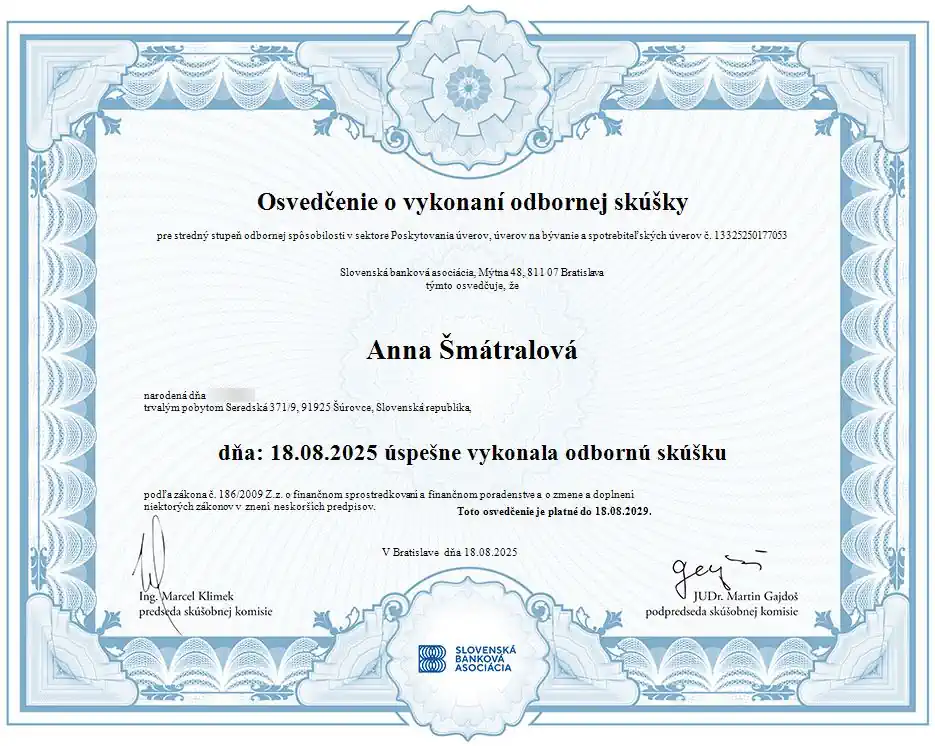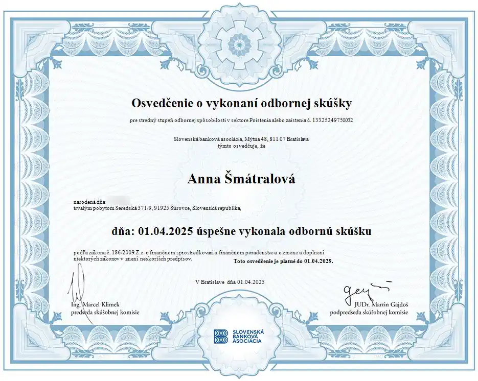 Zápis v Registri finančných agentov a finančných poradcov, vedenom Národnou bankou Slovenska, pod číslom: 285506.